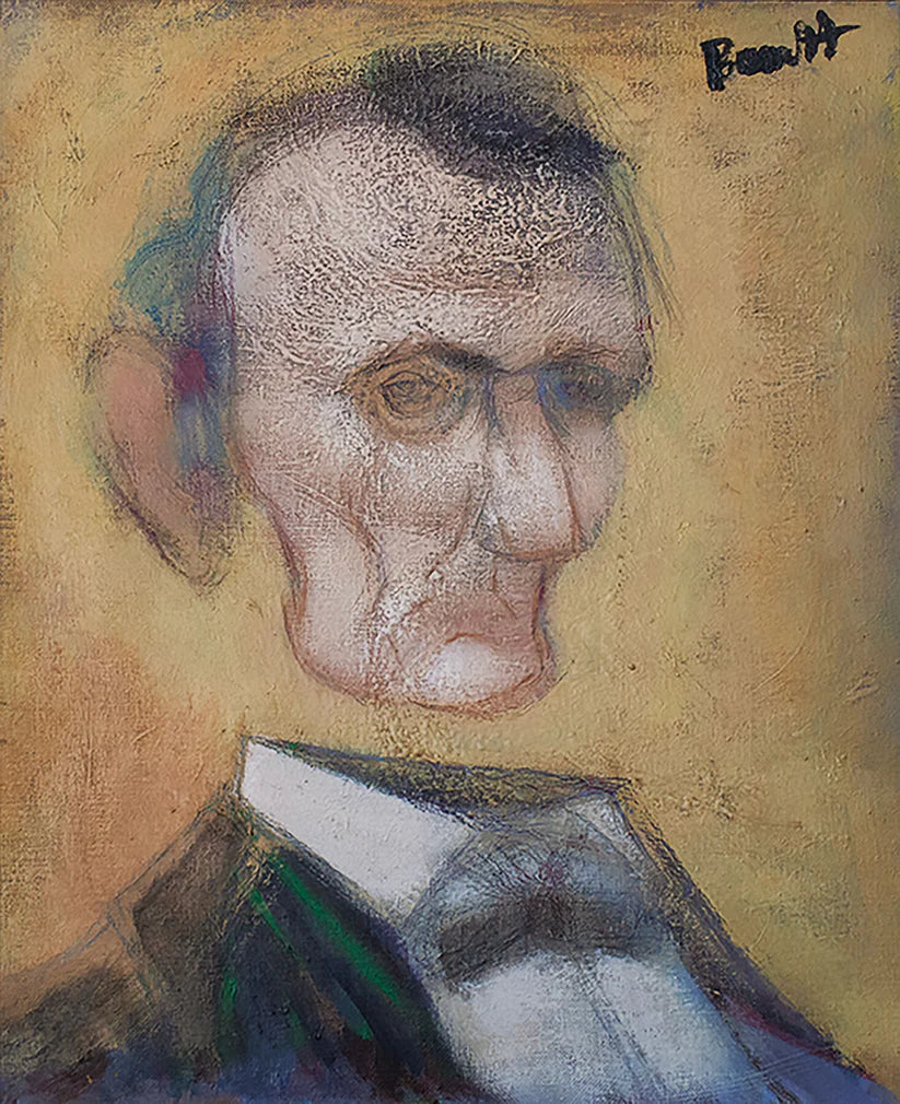 Lincoln Bust, 1991 Acrylic on canvas, 16x20in. Painted in 1991, Lincoln Bust distorts and elongates Lincoln's features, merging realism with expressive abstraction. Barrett works with a muted palette and subtle textures. The result is a powerful portrait that transforms the familiar icon through personal interpretation.